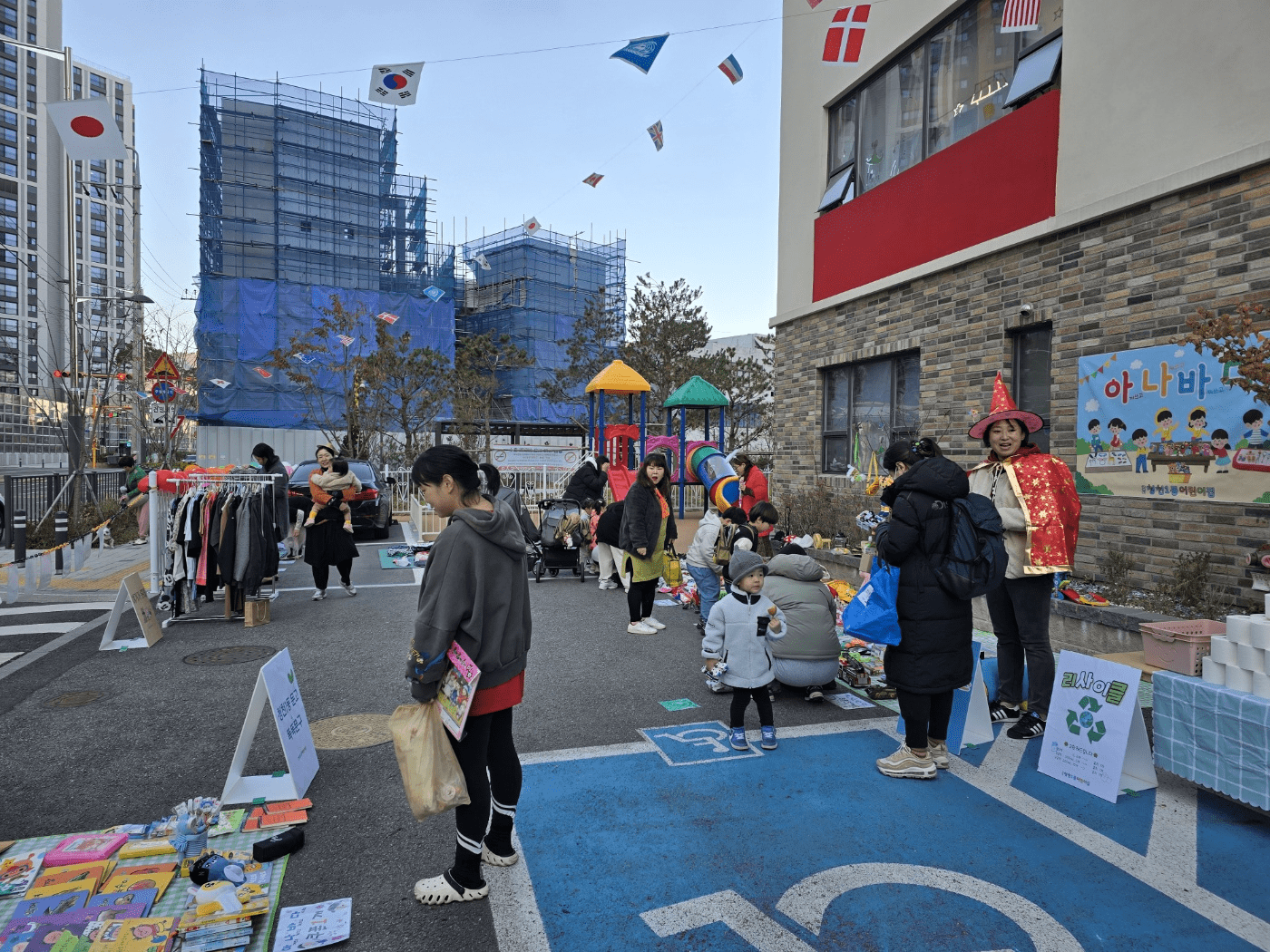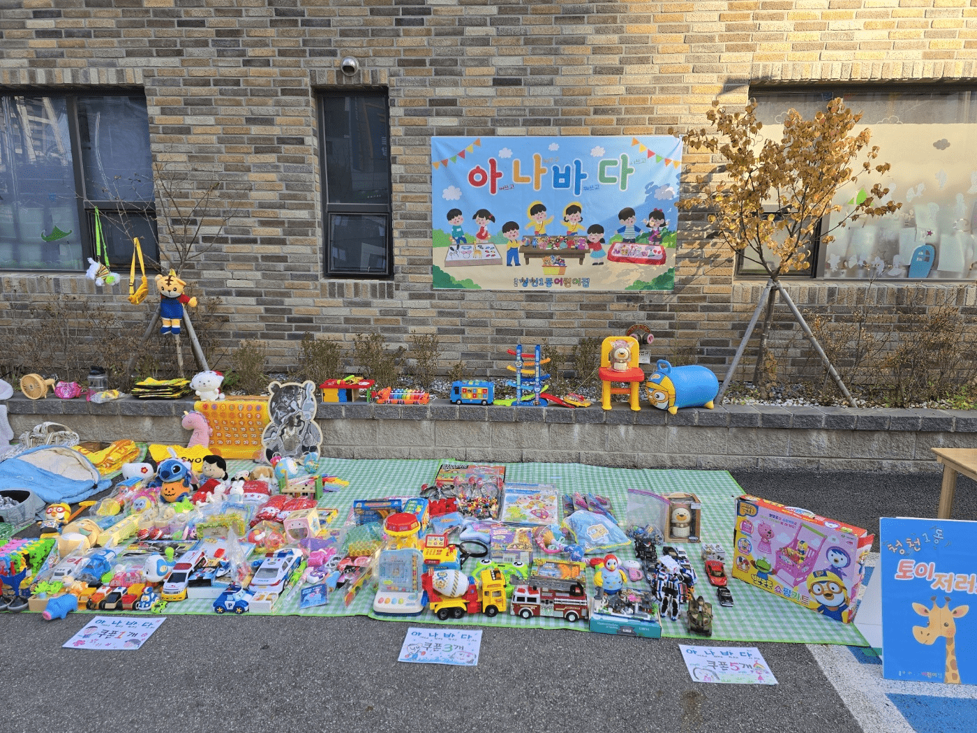 청천1동 어린이집에서는 매달 환경에 대한 경각심과 보호를 위한 활동으로 환경스페셜을 계획하여 진행하였습니다. 11월에는 미리 부모님들로부터 나누어 쓸 수 있는 물건들을 모아보고 쿠폰을 지급한 후 어린이집 마당에서 아나바다 활동을 진행하였습니다. 기증받은 물건들과 함께 마당에 펼쳐진 물품으로 꾸며진 공간은 영유아 의류, 성인 의류, 다양한 도서, 장난감, 리싸이클, 푸드코너, 인생한컷으로 하원하는 아이들과 부모님들의 눈길을 끌었고 쿠폰을 이용해서 원하는 물건을 구매하였습니다. 아나바다로 모인 수익금을 굿네이버스에 기부하며, 아름다운 가게에도 기증하기로 했습니다. 부모님들과 아이들 그리고 청천1동 교사들은 지구를 보고하고 자원을 아끼는 일에 적극적으로 동참하며 함께 즐기는 시간이었다.