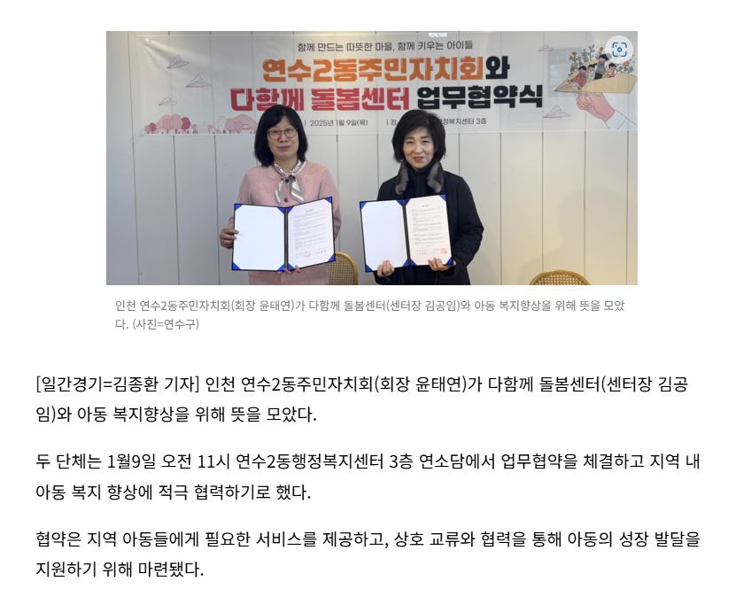연수2동 다함께돌봄센터, 주민자치회와 업무협약