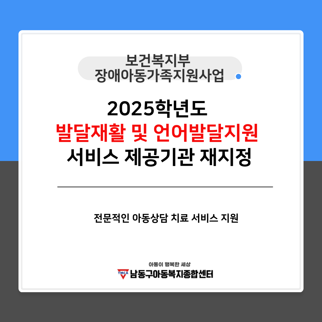 2025학년도 발달재활 및 언어발달지원 서비스 제공기관으로 재지정되었습니다!전문적인 아동상담 치료 서비스 제공과 아이들의 행복한 성장을 위해 더욱 노력하겠습니다. 문의 및 상담: 남동구아동복지종합센터 ☎️ 032-421-6100
