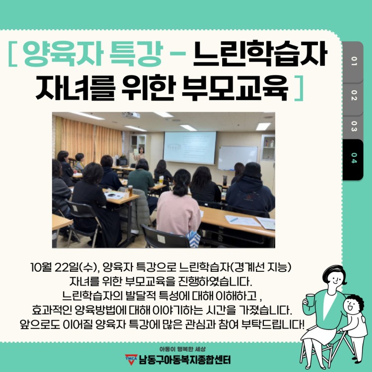 남동구아동복지종합센터(센터장 박혜선)에서 10월 22일(수), 느린학습자 자녀를 위한 부모교육이 진행되었습니다. 김수진 전문 강사님(성산효대학교대학원 심리상담학과 교수)과 함께 느린학습자의 정의, 느린학습자 아동의 발달적 특성, 양육과 지도 방법에 대해 알아보는 시간을 가졌습니다. 특강에 참여해 주신 보호자들께 감사드리며, 앞으로도 이어질 양육자 특강에 많은 관심과 참여 부탁 드립니다.