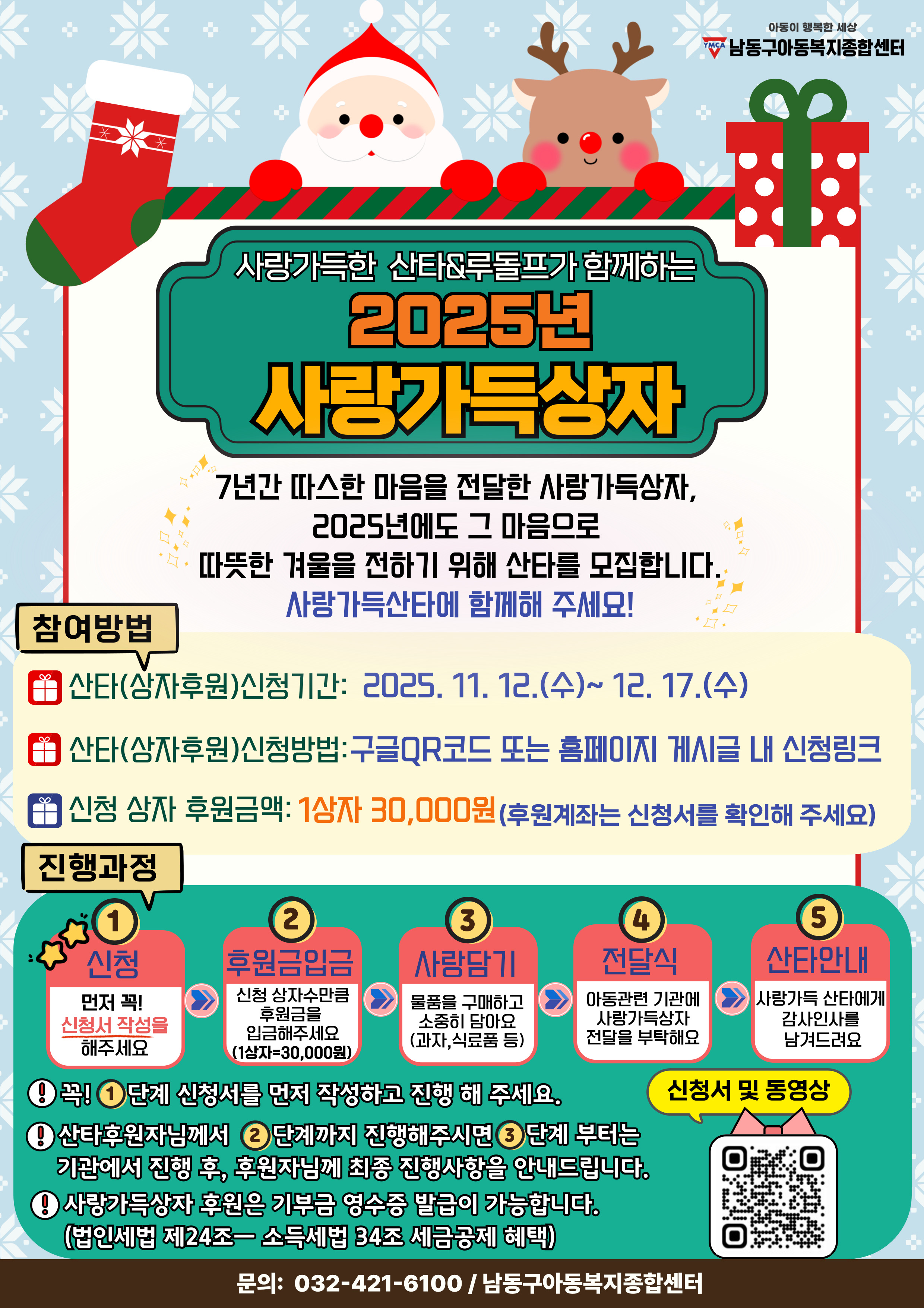 ♥2025년 산타 모집 안내 - 신청기간: 2025. 11. 12.(수)~2025. 12. 17.(수) - 신청 상자 금액: 1박스 30,000원 - 신청서 작성 및 후원금 입금 : 신청서 작성은 아래 링크 또는 홍보지 QR로 작성할 수 있어요. : 꼭 신청서 먼저 작성해 주세요! : 후원금은 자동이체가 되지 않아요, 신청서 내에 후원계좌를 꼭 확인하고 입금해주세요! : 기부금영수증 신청 시 입금자명으로만 신청 가능해요, 꼭 입금자명과 기부금영수증 신청자를 같게 신청해주세요!