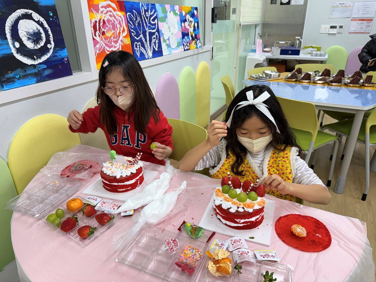 케이크 시트에 생크림을 바르고, 초콜릿과 과일 장식을 올리며 자신만의 개성이 담긴 케이크를 완성하며 즐거운 시간을 보냈다.