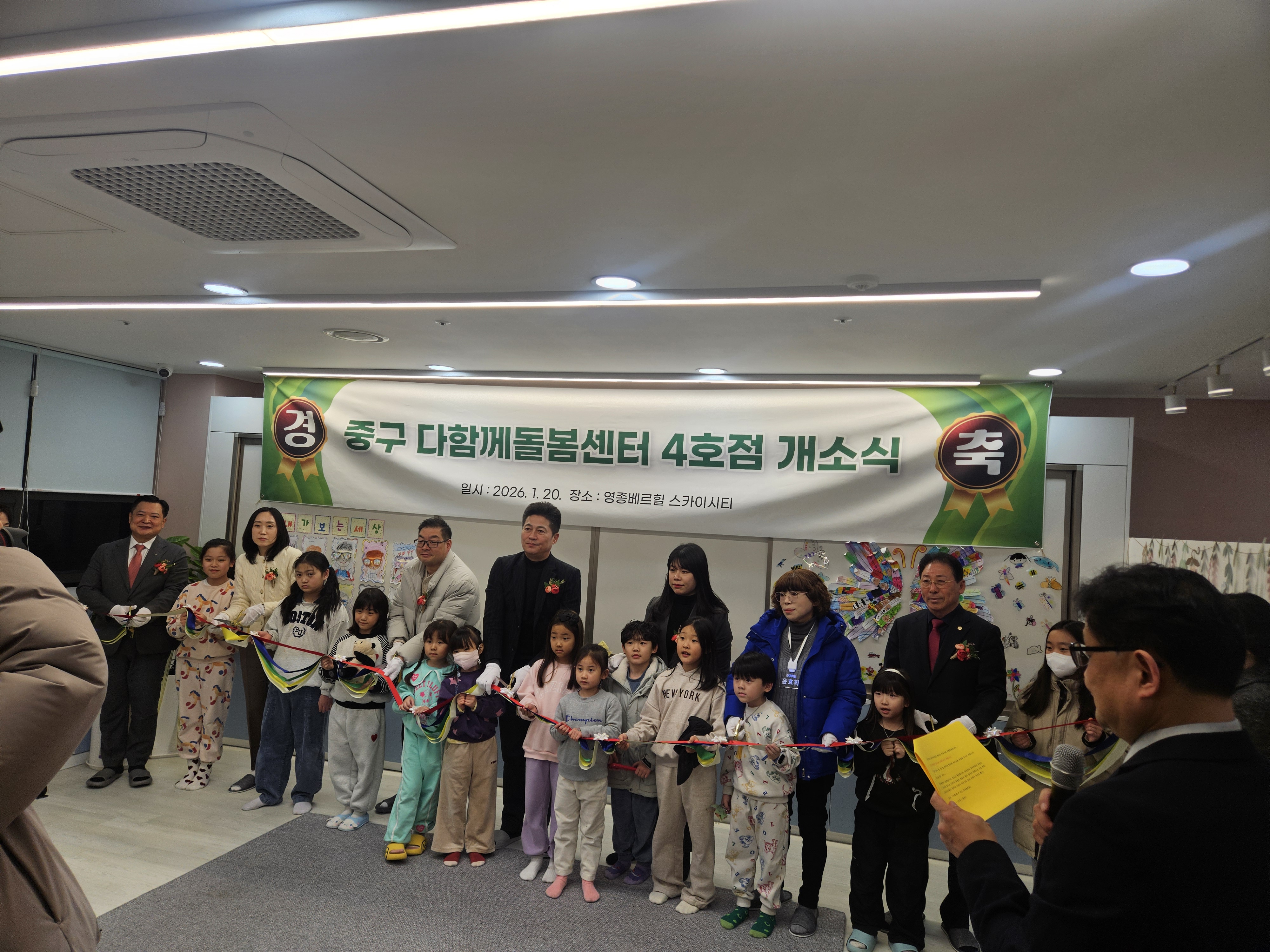 인천YMCA청소년재단에서 인천시 중구청으로 부터 수탁받은 중구 다함께돌봄센터 4호점이 2026년 1월 20일(화) 개소식을 진행하였다. 개소식에는 인천YMCA 조성일 회장과 김정헌 중구청장, 임현수 입주자대표회의회장 외에 구의원 및 입소 학부모들이 참석하여 성황리에 개최 되었다.