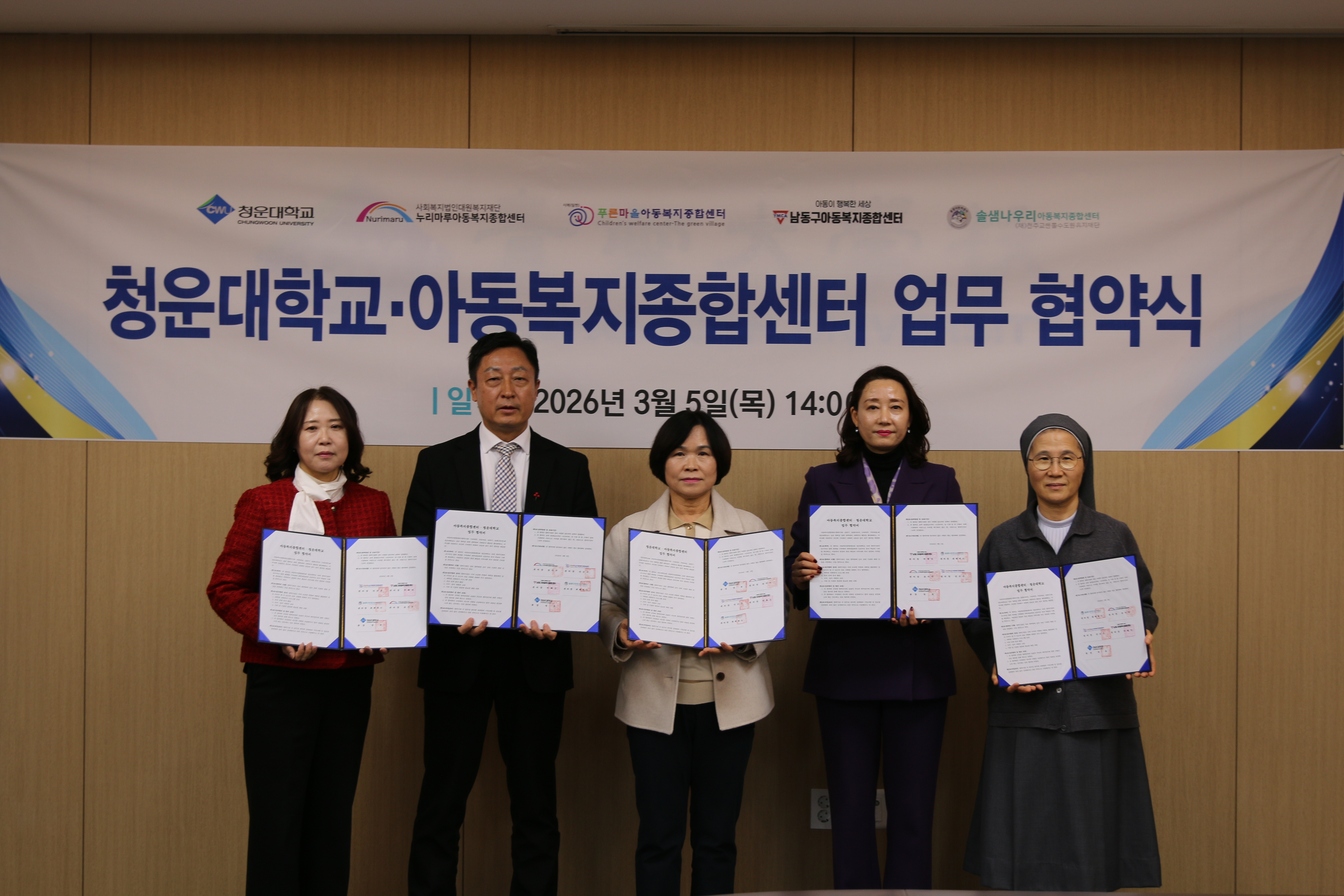 남동구아동복지종합센터는 청운대학교 및 인천시아동복지종합센터연합회와 함께 지역사회 아동복지 증진을 위한 업무협약(MOU)을 체결했습니다.