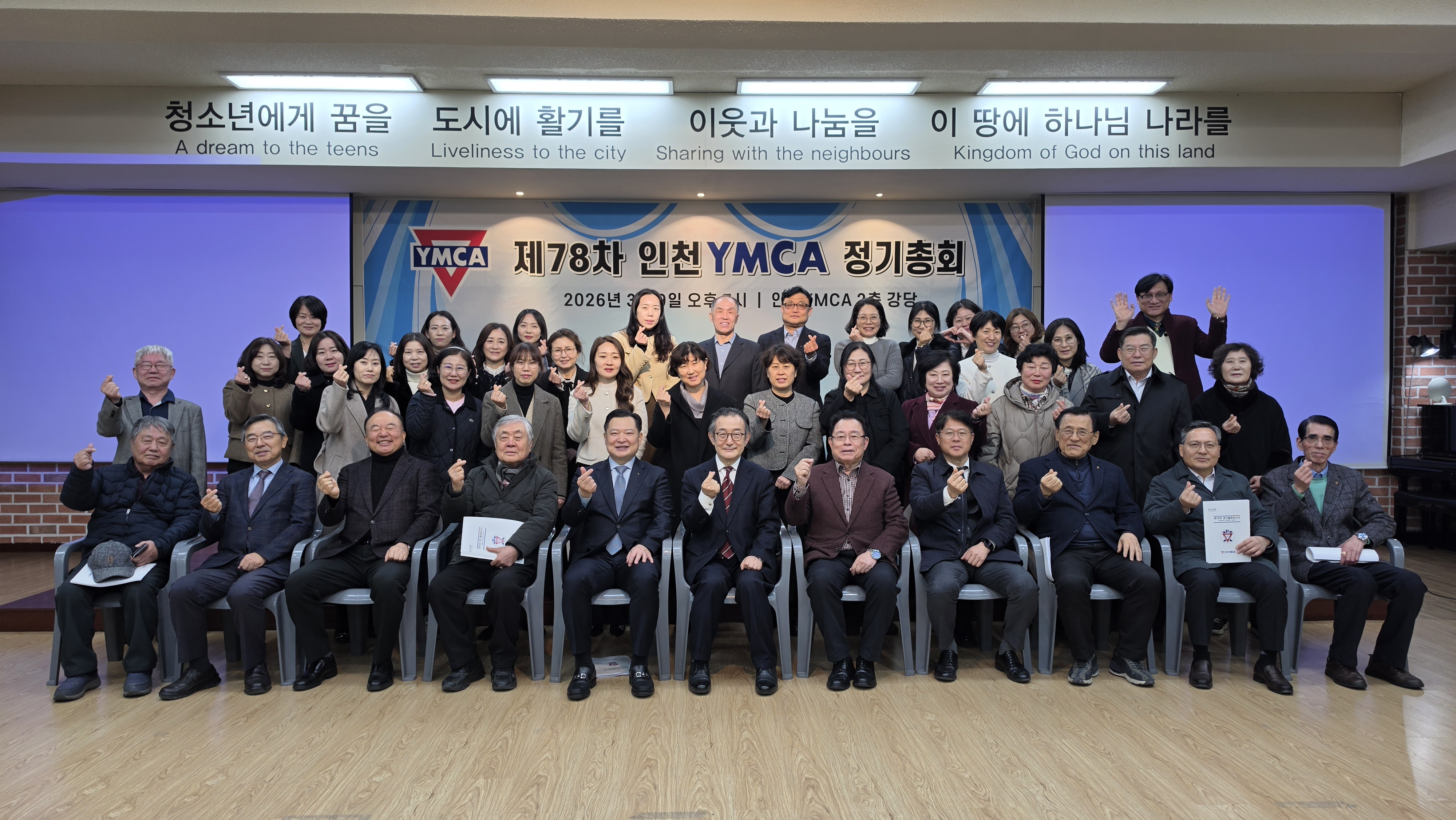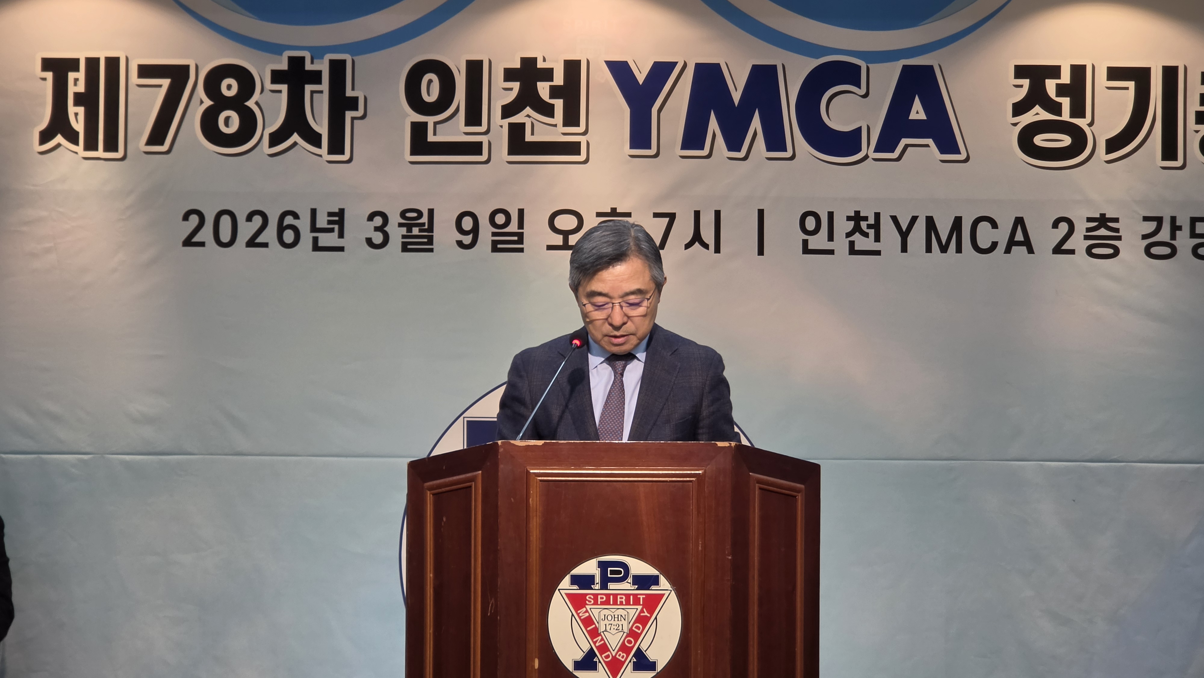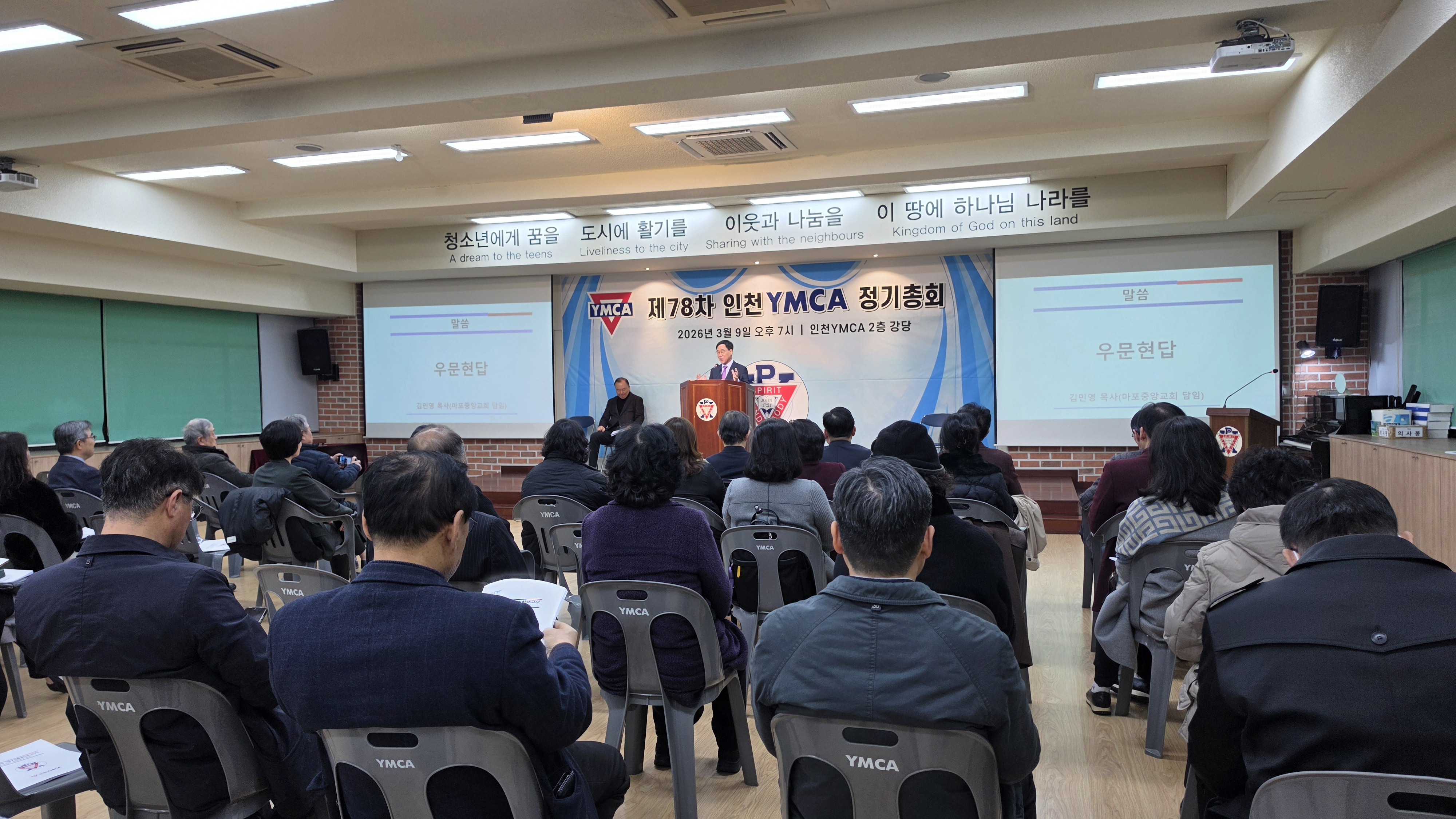 인천YMCA 제78차 정기총회 개최 "새로운 도약을 향한 화합의 장"인천YMCA는 지난 2026년 3월 9일(월) 오후 7시, 인천YMCA 회관 2층 강당에서 회원 및 관계자 70여 명이 참석한 가운데 ‘제78차 정기총회’를 성황리에 개최하였습니다. 1부 예배에서는 박홍준 부이사장의 사회로 진행되었으며, 이갑현 이사의 기도, 인천YMCA 여성합창단의 찬양과 마포중앙교회 김영민 목사님의 ‘우문현답’이라는 주제로 귀한 말씀을 전해주셨습니다. 참석자들은 설교를 통해 YMCA의 사명과 나아가야 할 방향을 깊이 되새기며, 지역사회를 위한 봉사와 헌신의 의지를 다지는 은혜로운 시간을 가졌습니다. 이어진 2부 본회의는 김홍섭 이사장의 주재 아래 질서 정연하게 진행되었습니다. 먼저 조성일 회장이 2025년도 주요 사업 성과와 결산 내용을 보고하였으며, 이어지는 2026년도 사업 계획 및 예산안 발표를 통해 올 한 해 인천YMCA가 추진할 핵심 과제들을 공유하였습니다. 특히 이번 총회에서는 조직의 내실을 기하고 변화하는 시대에 발맞추기 위한 헌장(정관) 일부 수정안이 회원들의 뜻을 모아 통과되었습니다. 이사후보 공천위원회에서 추천한 김홍섭, 강세인, 이선목 이사의 3년 연임안이 가결되었습니다. 앞으로도 세 분의 이사님들은 풍부한 경험과 리더십을 바탕으로 인천YMCA의 발전을 위해 힘써주실 예정입니다. 늦은 시간까지 자리를 지키며 인천YMCA의 앞날을 위해 소중한 의견을 보태주신 모든 회원분께 깊은 감사를 드립니다. 2026년에도 우리 인천YMCA는 지역사회와 청소년을 위해 깨어 있는 조직으로 최선을 다하겠습니다. |