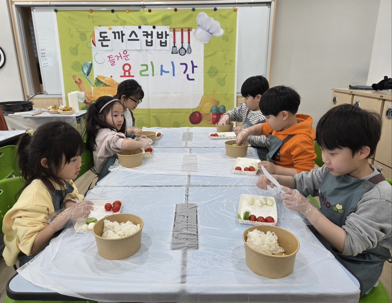 미추홀구다함께돌봄센터6호점에서는 3월 24일(화) ‘돈가스 컵밥’ 요리 활동을 진행하였다. 1. 방울토마토, 메추리알, 오이를 자르고 2. 저울에 올려놓은 컵에 밥 160그램과 양배추 30그램을 계량하는 과정에서 요리 체험은 수학적 개념을 자연스럽게 습득할 수 있는 활동임을 느낄 수 있었다. 3. 안전장갑을 착용하고 아이들이 좋아하는 포켓몬 시리즈 피카츄 모양의 돈가스를 조심스럽게 튀긴 후 케찹으로 눈,코,입 꾸미기 작업으로 마무리하였다. 4. 디저트로 블랙포도, 샤인머스캣, 딸기를 투명컵에 담으면서 아이들은 연신 행복한 표정으로 만족감을 표현했다.